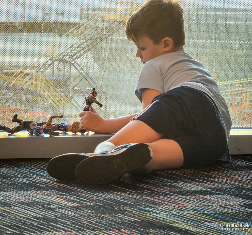 Getting into LAX turned out to be easy, thank you TSA pre-check! We even had time for a milkshake. And it wasn’t a zoo in the waiting area. There was a little boy who had a surprising number of wrestling action figures and I had a blast photographing him. (If I post an image of him playing it will not show his face.)