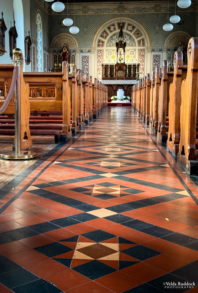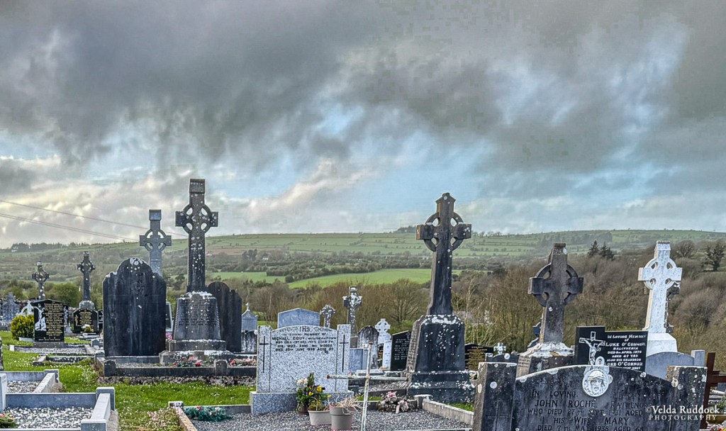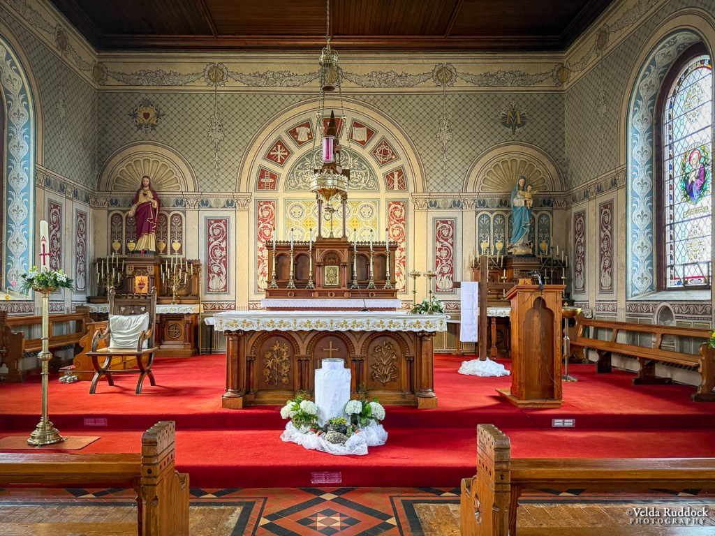 Nearby is the village of Glenmore, and the Catholic church contains the family history. It’s a beautiful building. The pews, the stained glass windows, and other places in the chapel bear the names of towns and families who have supported the parish over the decades. In the 1970s an effort to modernize the place nearly covered the mosaic behind the altar, but that was halted by the community. It is perched on a hill, and there is a magnificent view from the cemetery.