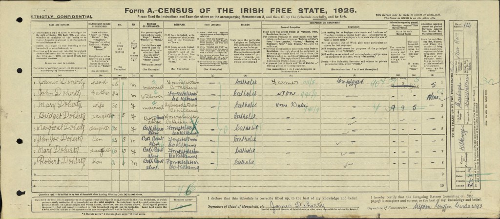 Last weekend the Irish government released the 1926 Census. This is the first enumeration of the Irish Free State, established in 1922, and it contains a list of everyone in the Doherty family who was living in Forristalstown that year.