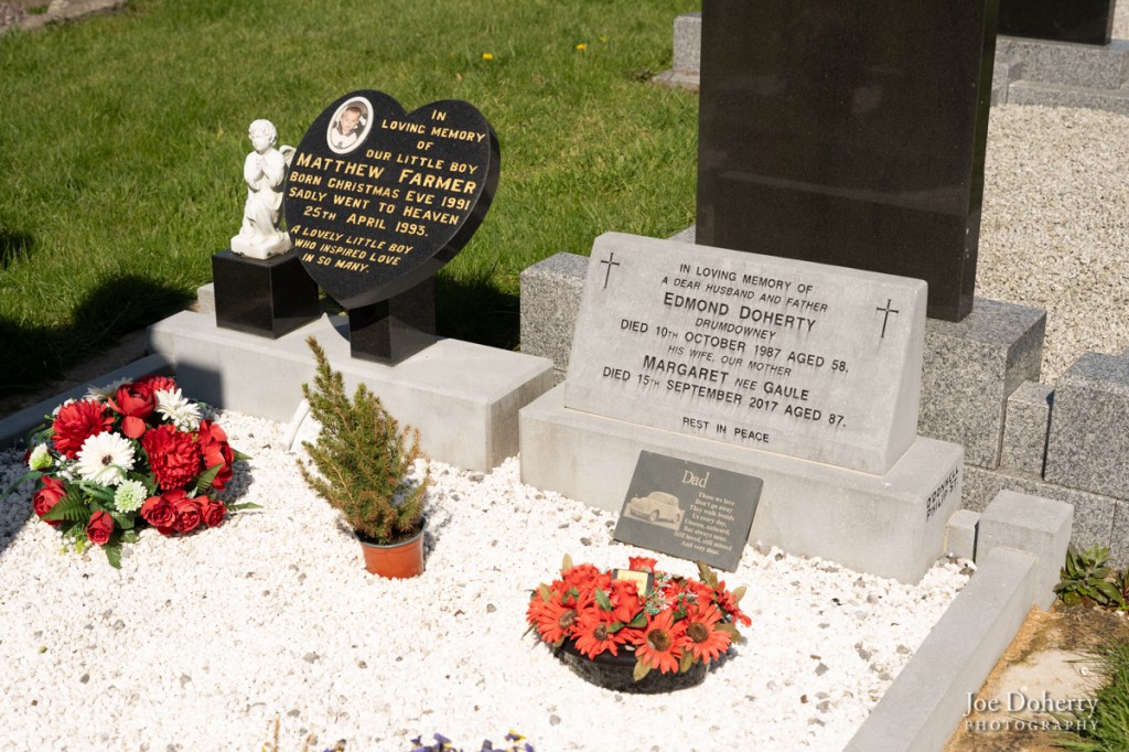 Mary picked us up from our hotel in Waterford. On the way back to her house she asked if we’d like to see her family’s plot in the graveyard. We said yes, obviously. It was a different graveyard, at the parish church in Slieverue, down the road from Glenmore. How did they end up here? I don’t know. It wasn’t birth-order related, from the available evidence. Younger brother Seamus took over running The Home Place (Forristalstown) while Edmond was farming near here.